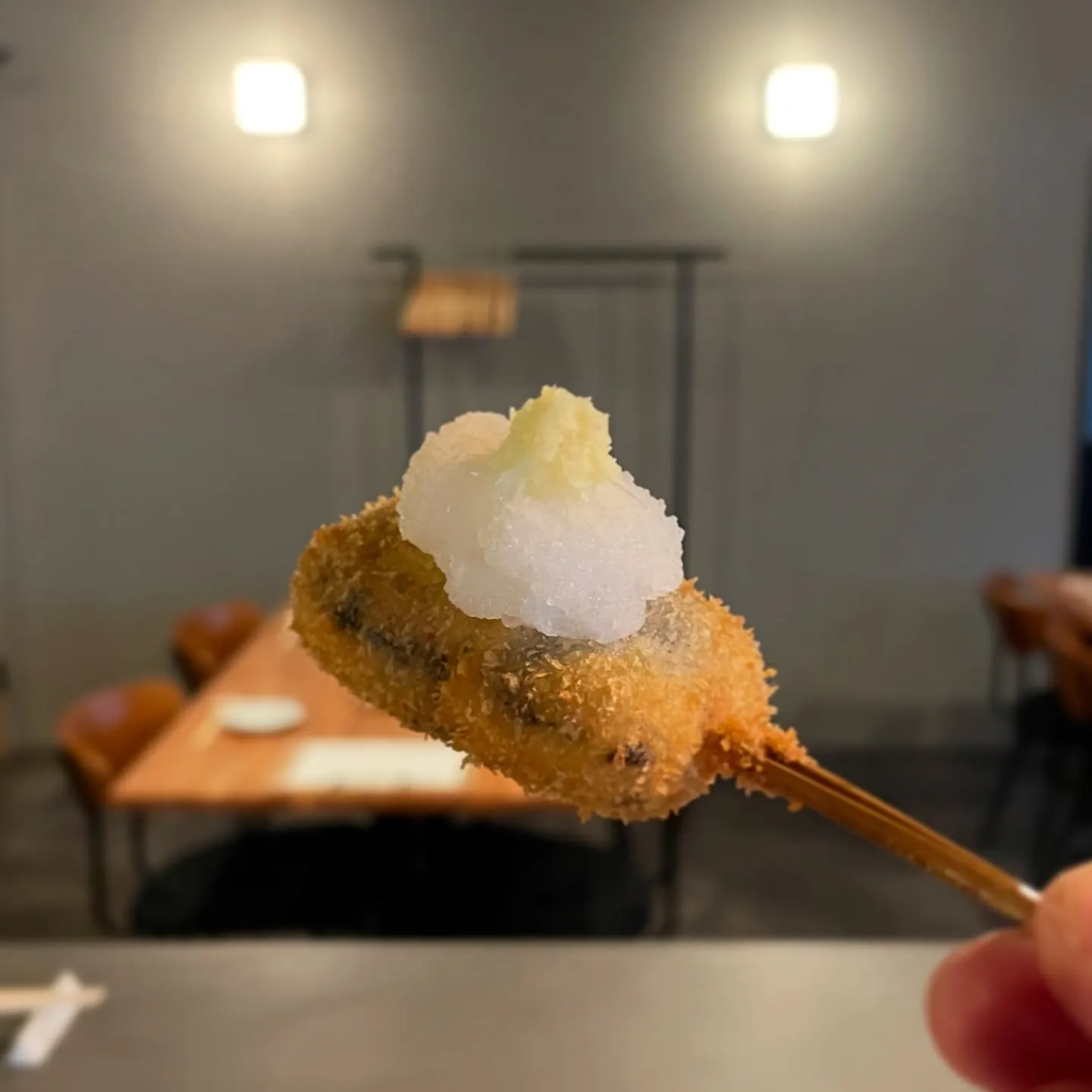 ナスの揚げ浸し 2025/06/09 ナスの揚げ浸し 高温の油でさっと揚げた茄子をお出汁に浸したものを串カツにしました。 生姜と大根おろしに出汁醤油をかけて仕上げます。 口の中にジュワッと広がる優しい出汁と茄子をお楽しみください🍆 ご予約はDMからでも受け付けてますのでお気軽にどうぞ 本日も17:00-23:00でお待ちしております!